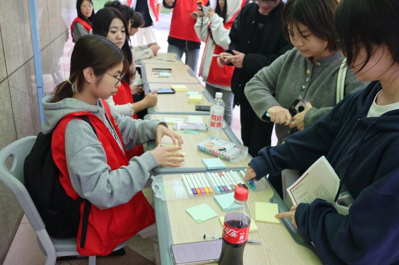 在布置温馨的展板前,同学们驻足书写,用两种颜色的便签,完成了一场无声的对话: