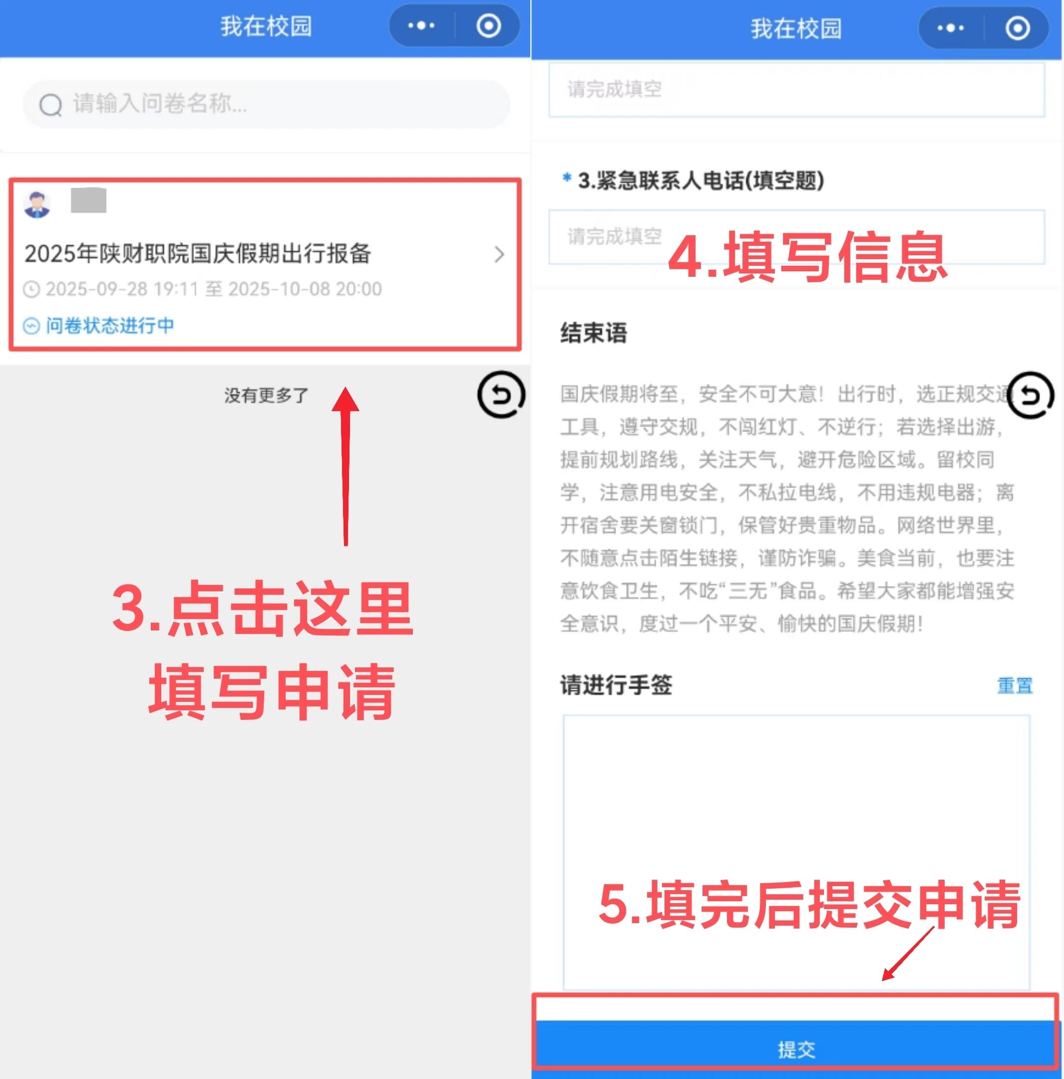 同学们别忘了离校前打开“我在校园+”,填写“2025年陕财职院国庆假期出行报备”离校报备单哦!