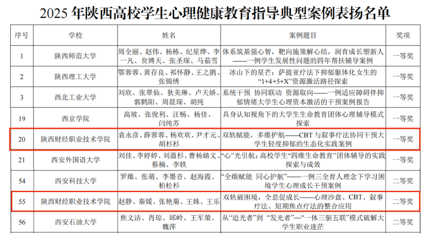 由袁永彦教师团队撰写的《双轨赋能,多维护航——CBT 与叙事疗法协同干预大学生轻度抑郁的生态化实践案例》和赵静教师团队撰写的 《双轨破困境,全息促成长——心理沙盘、CBT、叙事疗法、短期焦点疗法的整合应用》分别荣获2025年陕西高校学生心理健康教育指导典型案例一等奖、二等奖。