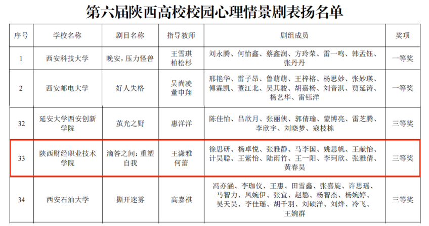 近日,中共陕西省委教育工委印发《关于第十届陕西高校“阳光护航”心理育人宣传季实践活动成果展示表扬名单的通知》(陕教工函〔2025〕175号),我校表现突出,成绩优异,共斩获一等奖3项、二等奖1项、三等奖1项、优秀奖1项。我校推选的两例2025年陕西高校学生心理健康教育指导典型案例分别荣获一等奖和二等奖;两例2025年陕西高校学生心理健康教育指导典型经验均获一等奖;第六届陕西高校校园心理情景剧荣获三等奖;第七届陕西高校大学生心理健康科普知识竞赛暨心理素质拓展运动嘉年华活动荣获优秀奖。