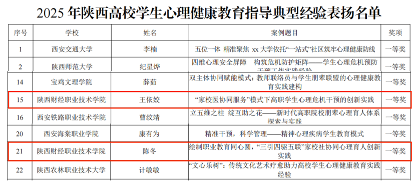 由教师王依姣撰写的《“家校医协同服务”模式下高职学生心理危机干预的创新实践》和陈冬撰写的 《绘制职业教育同心圆,“三引四驱五联”家校社协同心理育人创新实践》均荣获2025年陕西高校学生心理健康教育指导典型经验一等奖。