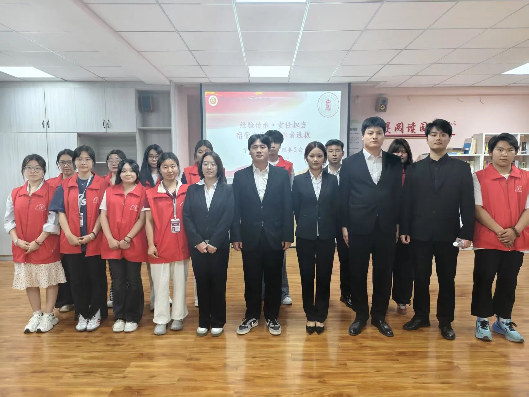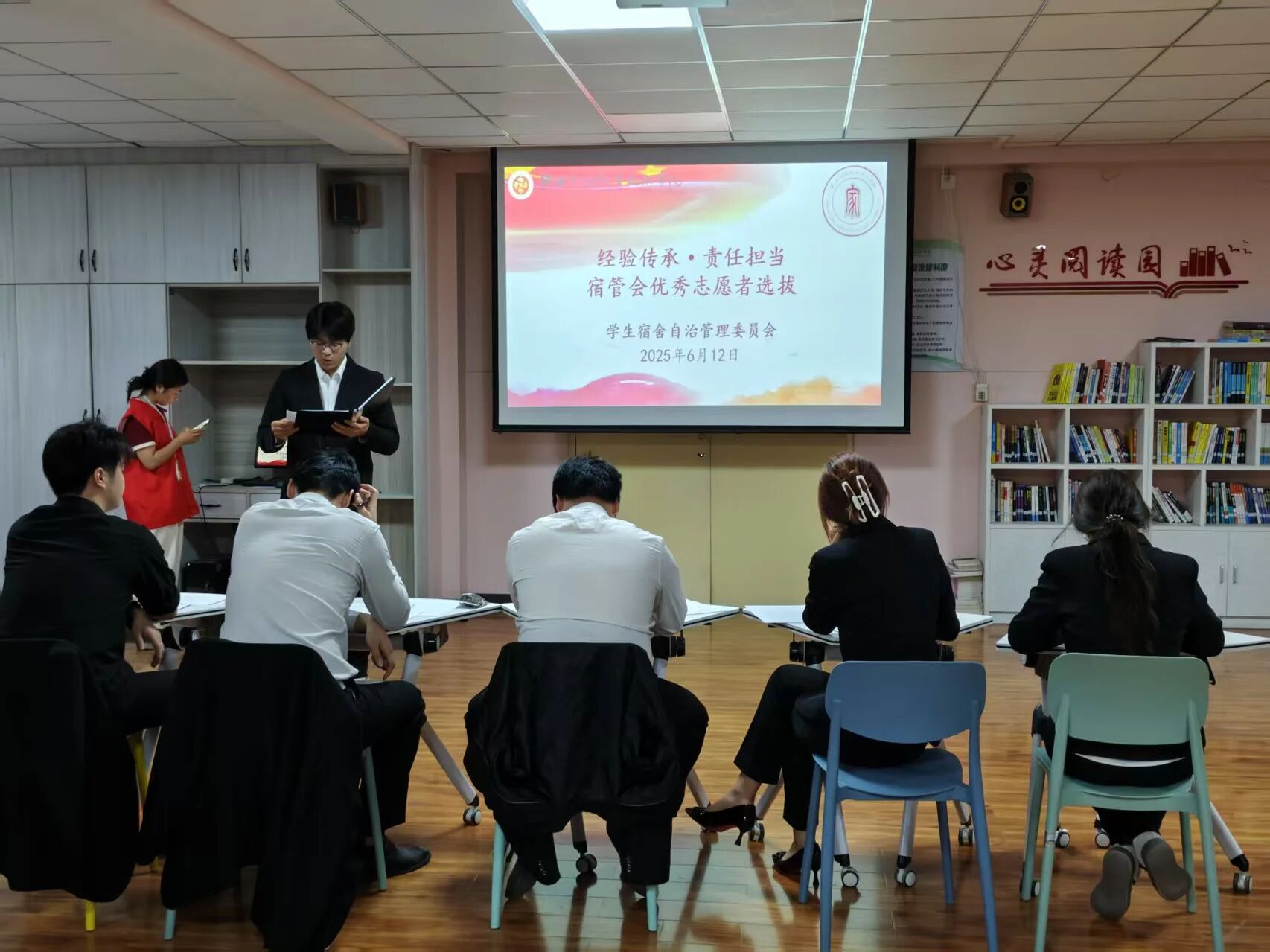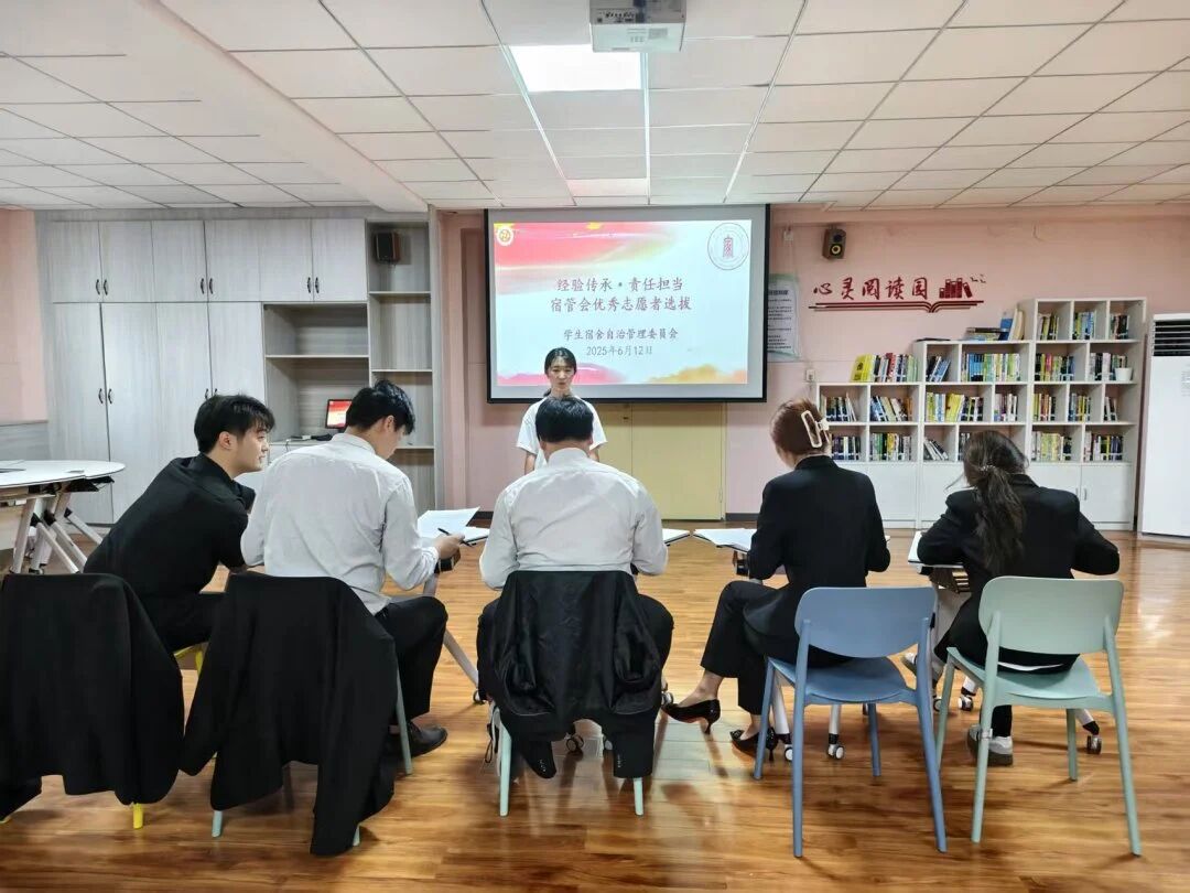 2025 年 6 月 12 日,学生宿舍自治管理委员会在五号楼二楼的心理活动室,精心组织并开展了一场意义非凡的宿管会优秀志愿者选拔评选活动。此次活动的主要目的在于深入挖掘和表彰在志愿服务过程中涌现出的先进典型人物,大力弘扬“奉献、团结、勤奋、严谨”这一崇高而宝贵的志愿精神。
