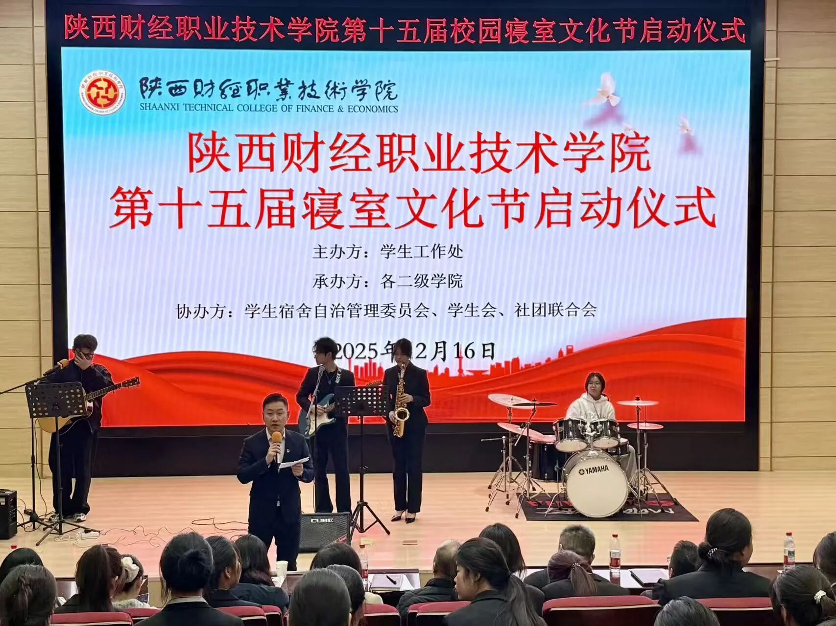2025年12月16日17:00,陕西财经职业学院第十五届寝室文化节启动仪式在学院学术报告厅举行。学生工作处处长乔晶策,学生工作处副处长刘明、学生工作处副处长连静、各二级学院学生管理科科长、学生工作负责人、辅导员代表、公寓代表、学生会代表、社团联合会代表以及宿管会全体成员300余人齐聚一堂,以青春之名赴文化之约,共同开启这场以“温馨陕财 ‘寓’见美好”为主题的寝室文化盛宴。