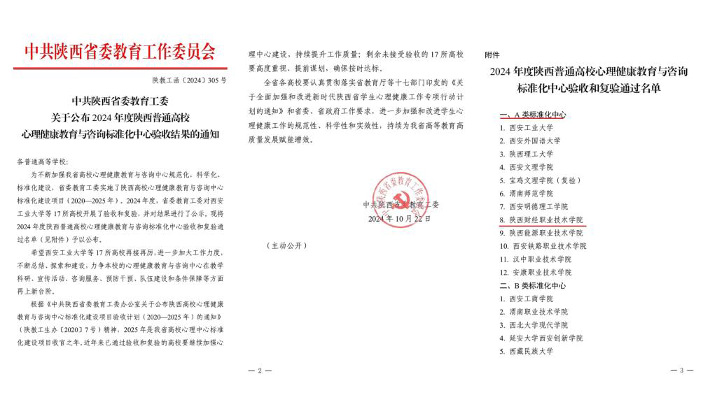 近日,中共陕西省委教育工委发布了《关于公布2024年度陕西普通高校心理健康教育与咨询标准化中心验收结果的通知》(陕教工函〔2024〕305号),我校大学生心理健康教育中心顺利通过项目验收,获评"陕西普通高校心理健康教育与咨询A类标准化中心”。
