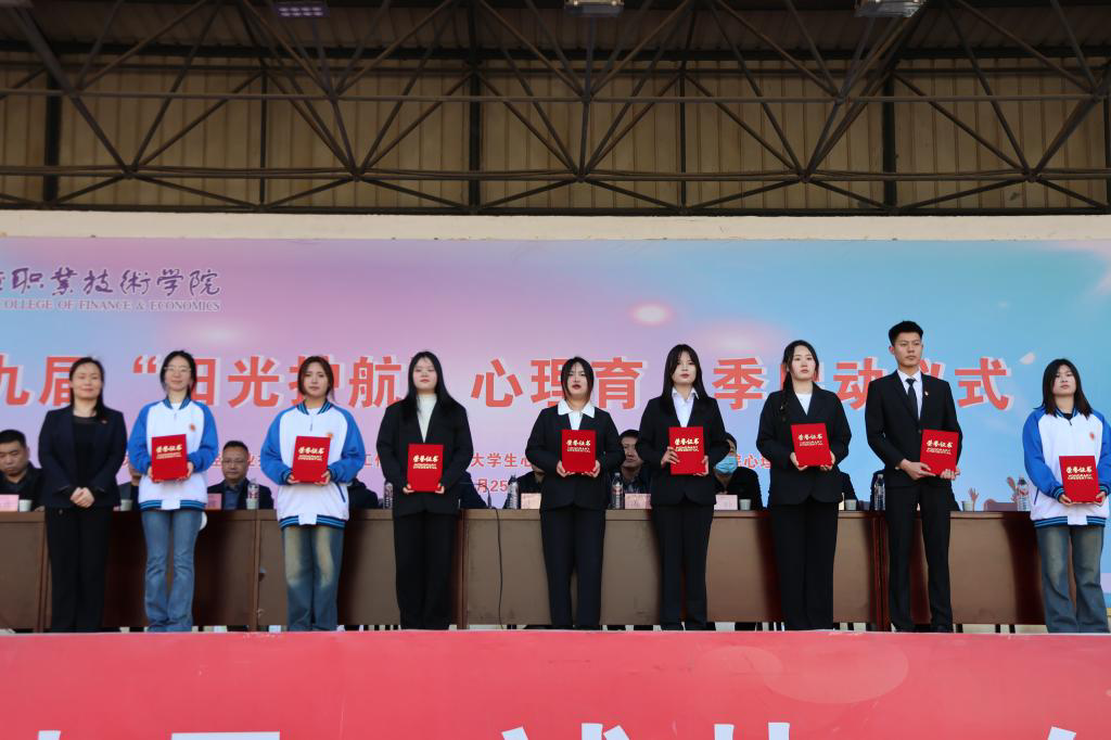 全体2023级新聘心理委员庄严宣誓 随后,学生工作处副处长王刚对2023年心理健康教育工作进行了全面总结。学生工作处副处长袁永彦宣读了《关于开展第九届“阳光护航”心理育人宣传季实践活动的通知》,详细介绍了本次宣传季的各项活动和计划。大学生心理健康教育中心主任杨欢欢为“最美心委”颁发荣誉证书。全体2023级新聘心理委员进行了庄严的宣誓。