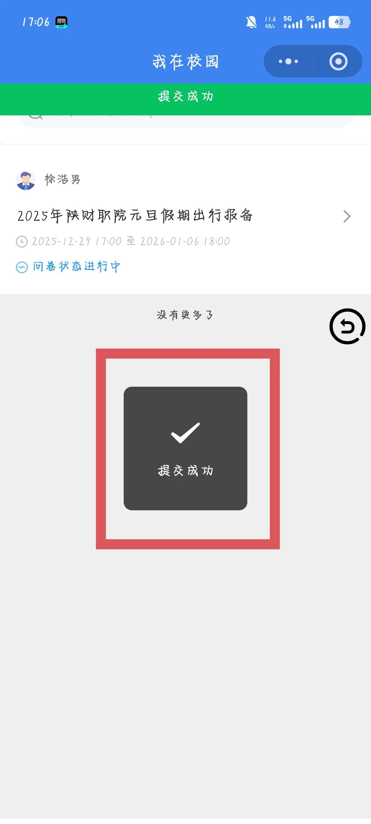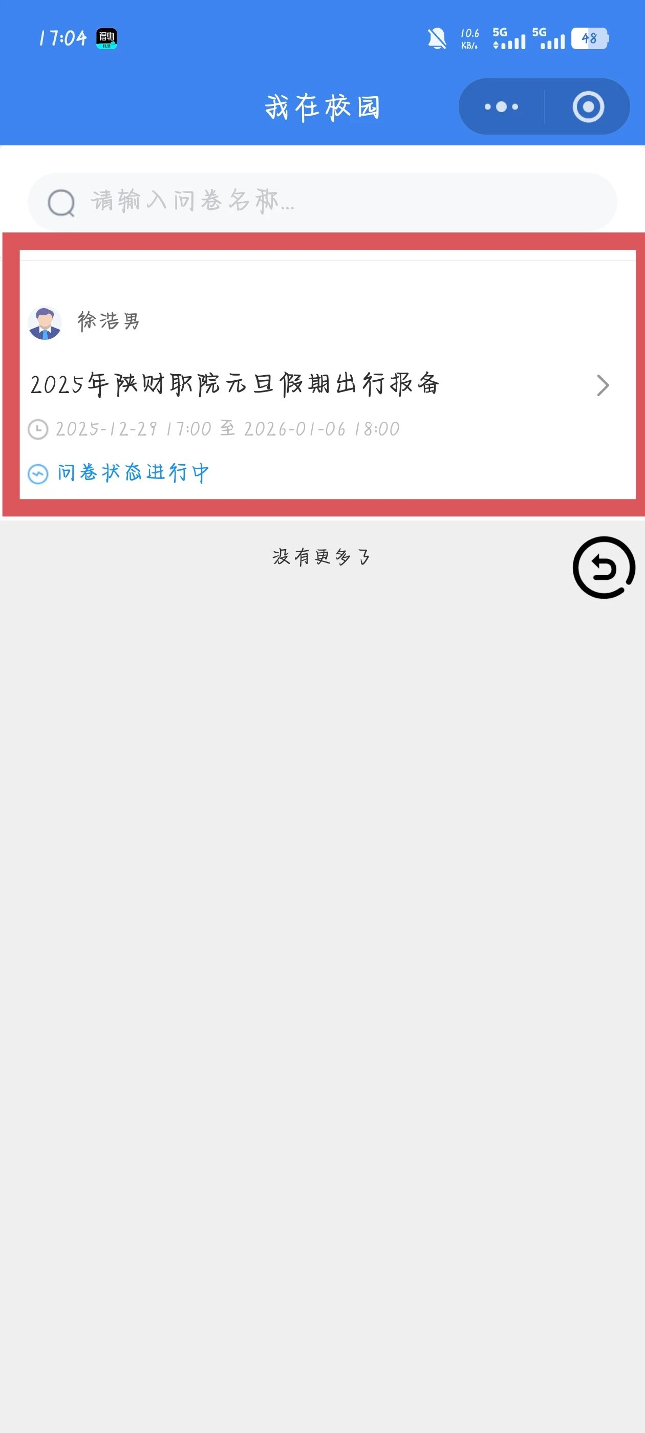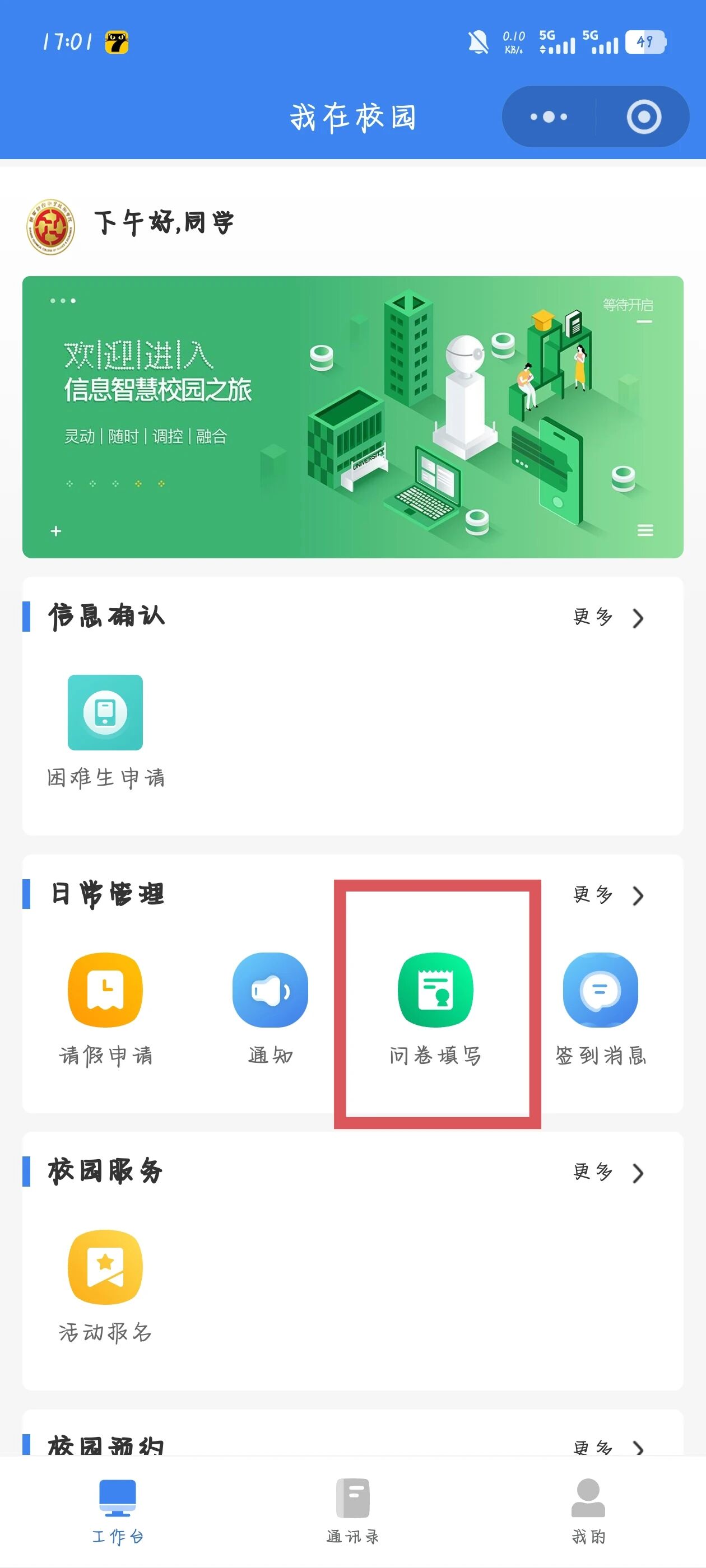 放假前,请各位同学务必在“我在校园”微信小程序及时完成问卷调查的填写工作。(流程如下)