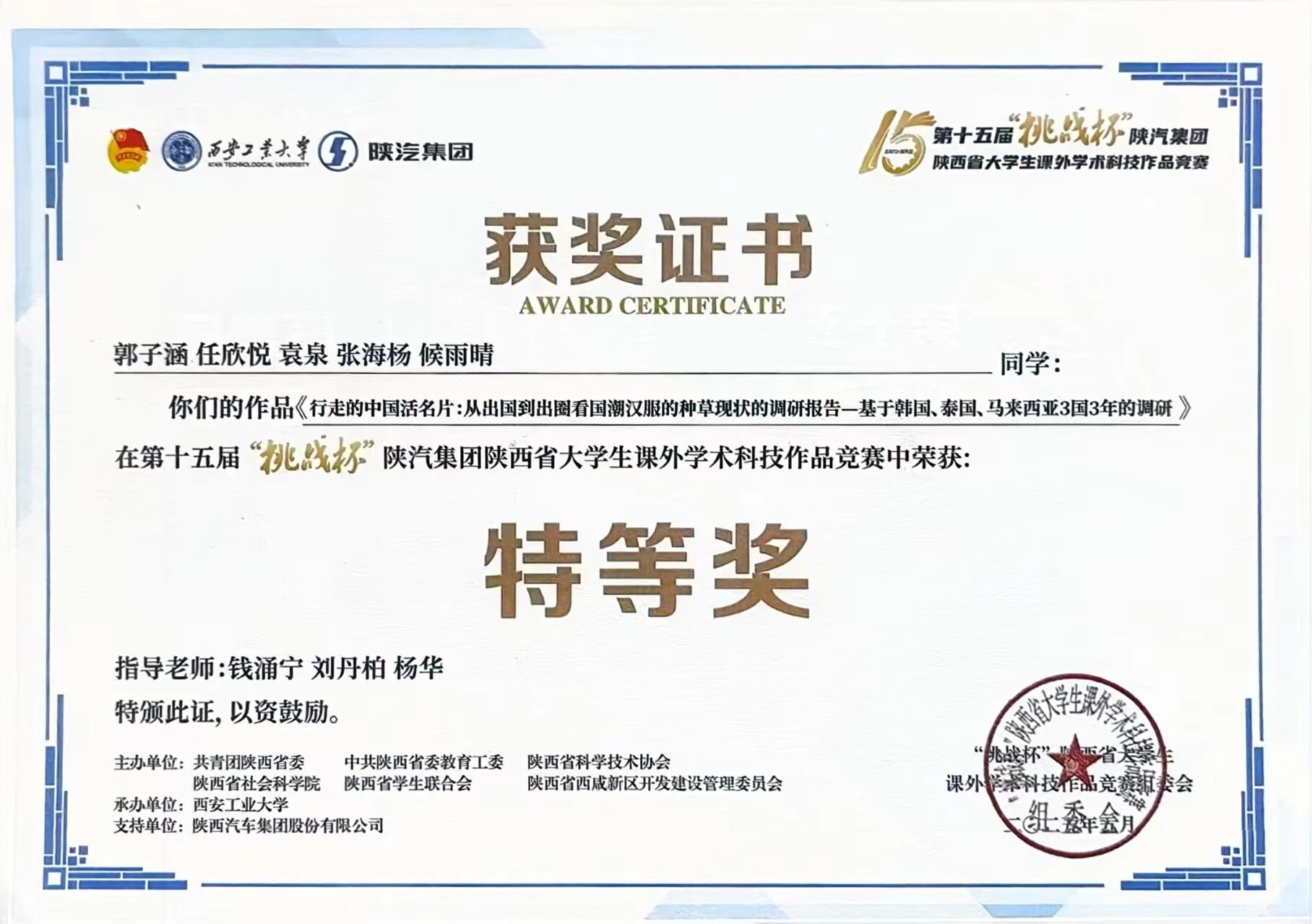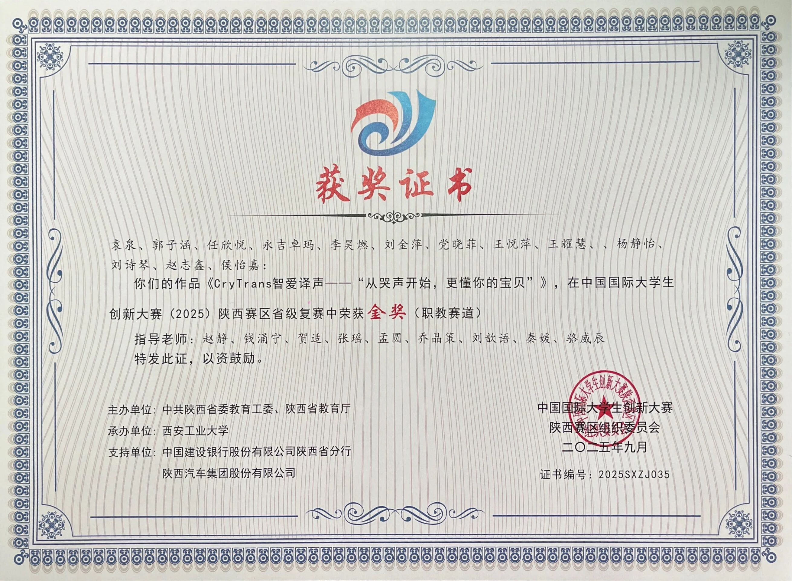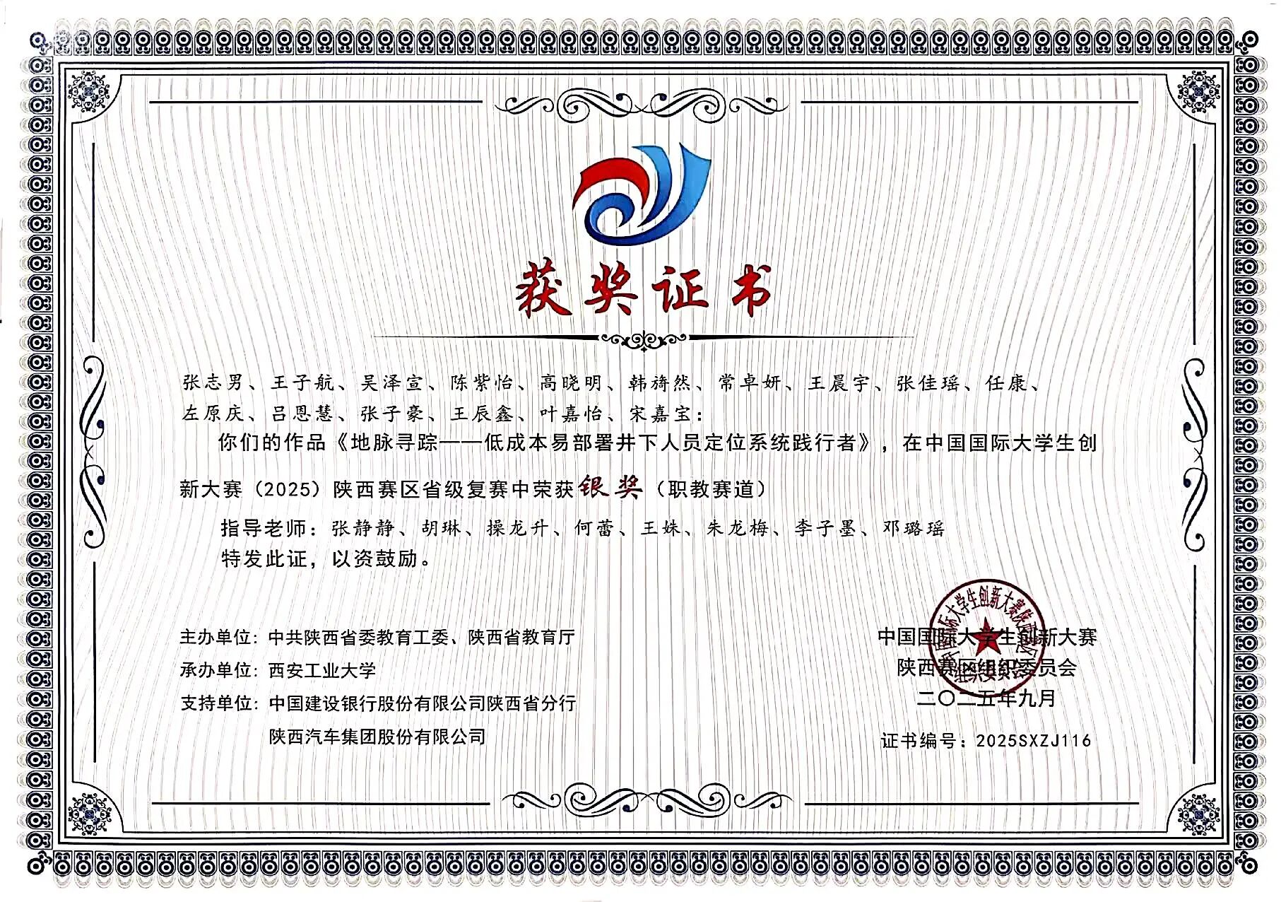 该生在校期间学习上勤奋钻研,刻苦努力,专业成绩位列年级前列,荣获校级二等奖学金和“三好学生”荣誉称号,考取英语B级证书。积极参与各项学科竞赛,获得2025年中国国际大学生创新大赛省级金奖、第十五届“挑战杯”陕西省大学生课外学术科技作品竞赛特等奖。课余时间积极投身各类社会实践活动,积极参加暑期“三下乡”社会实践活动,不断提升个人综合能力。