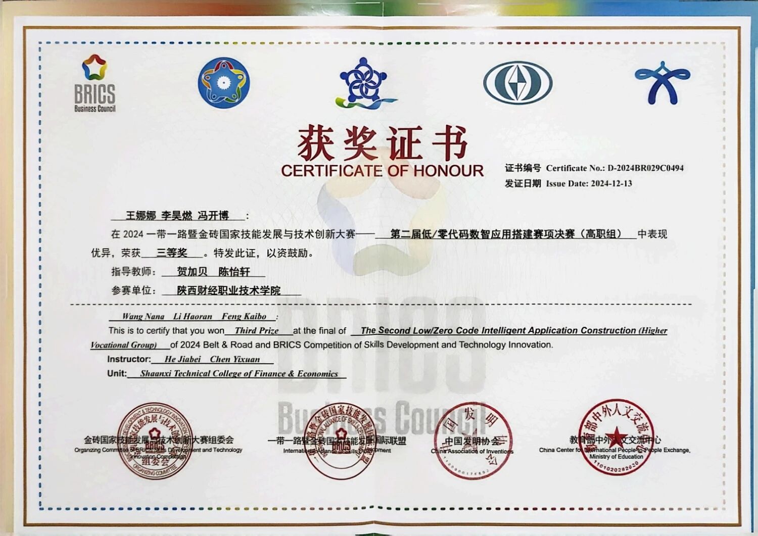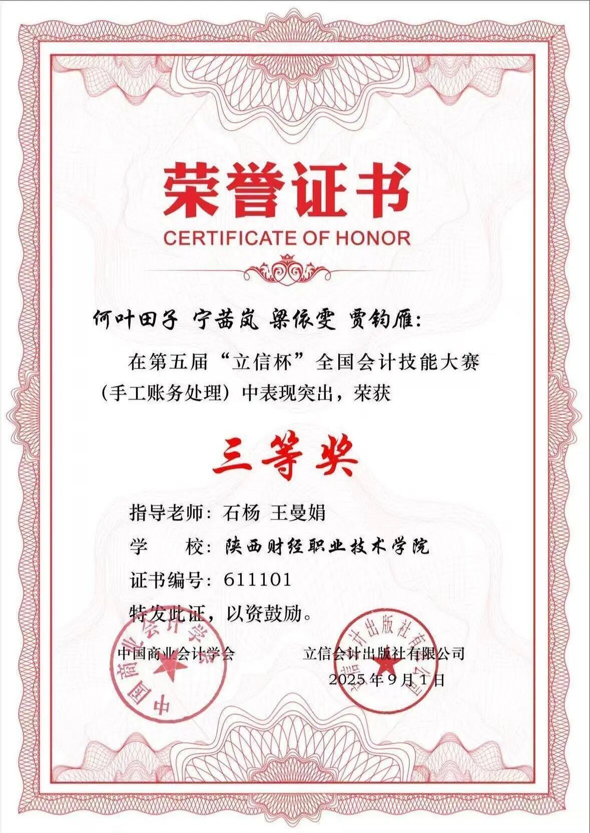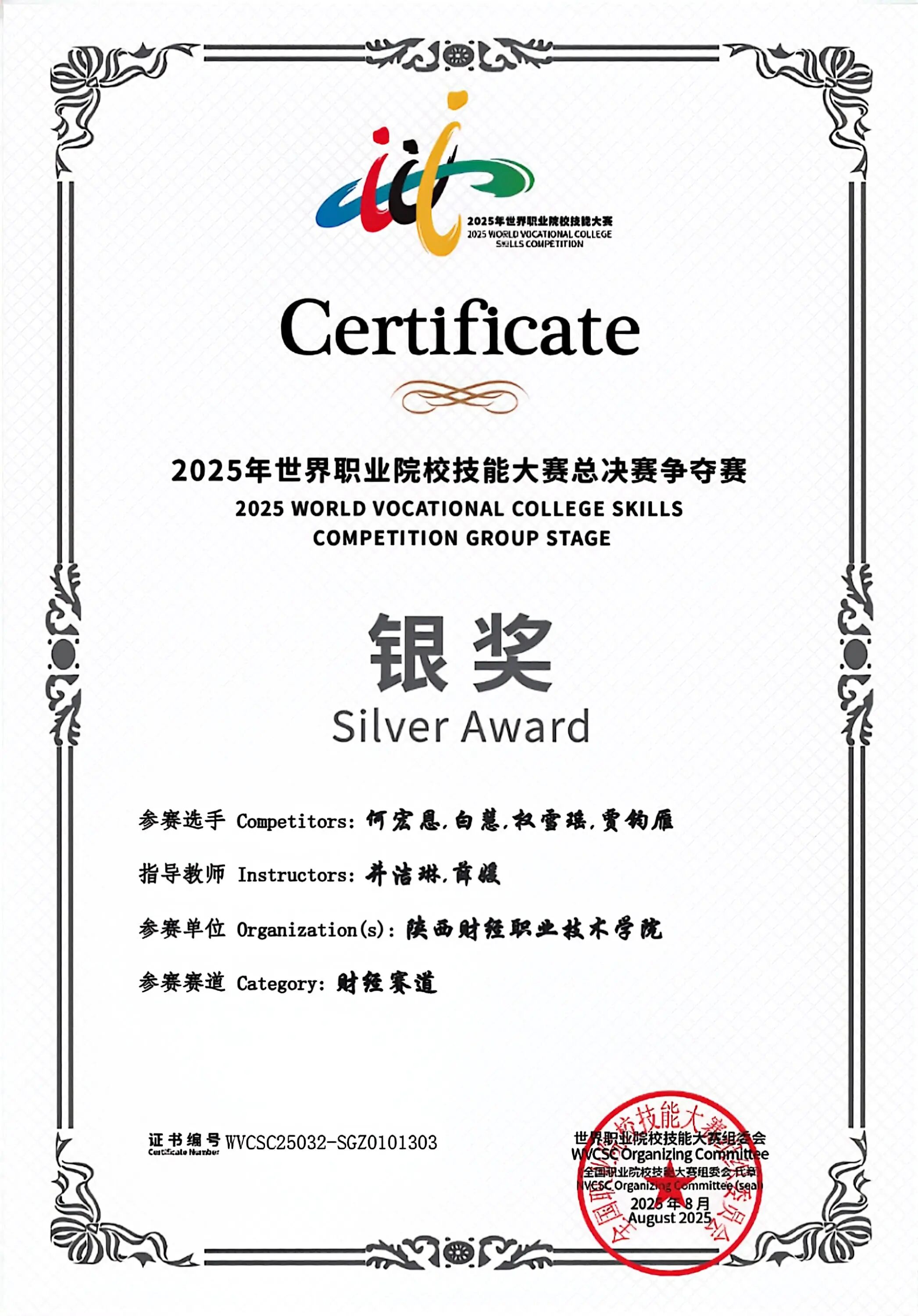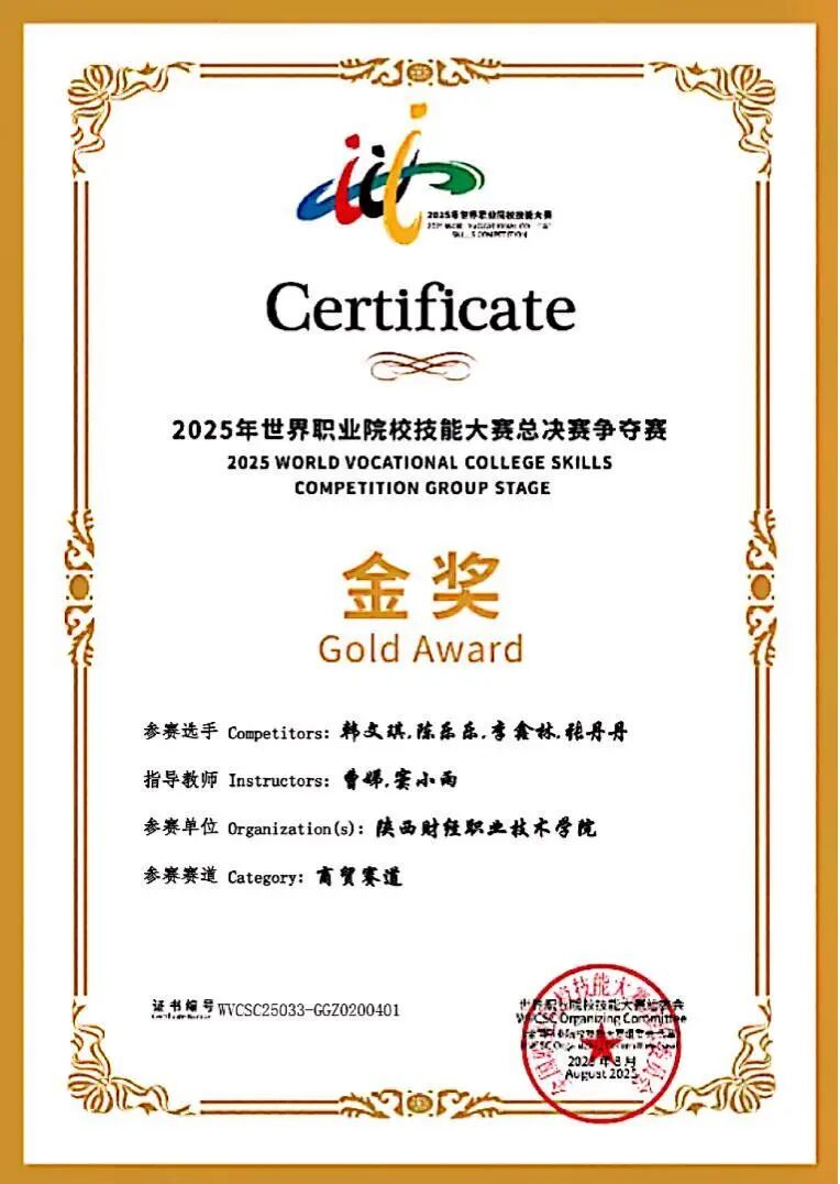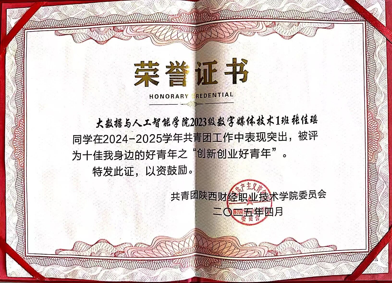 该生在校期间担任班级团支书,秉持“以赛促学,以技赋能”的信念,在学习上勤奋好学,表现优异,获得国家励志奖学金;在专业学习、学科竞赛与科研探索中取得突出成绩,取得全国会计专业技术初级资格证书、华为AI开发者认证等多项证书,获得2025年世界职业院校技能大赛全国银奖、第五届“立信杯”全国会计技能大赛三等奖、陕西省职业院校技能大赛金奖、中国国际大学生创新大赛银奖等多项荣誉。