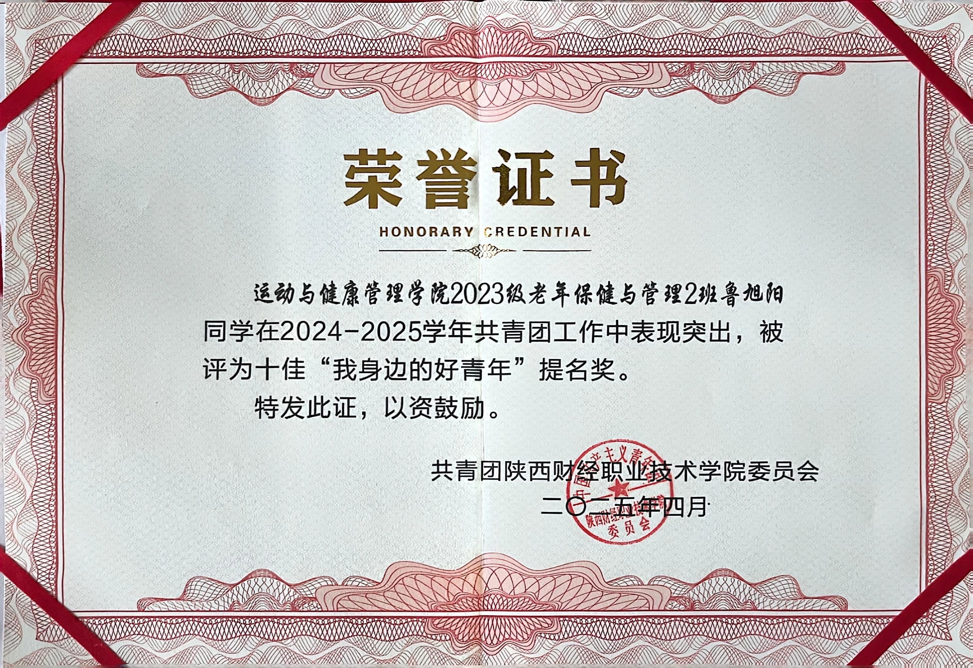 该生在校期间担任班级团支部书记、学院大健康工作室会长,学习上刻苦钻研,连续两年荣获国家励志奖学金、品学兼优奖学金,积极参加技能大赛,荣获陕西省技能大赛社区实务服务赛项金奖、全国大学生数学建模竞赛陕西一等奖、中国国际大学生创新大赛省级银奖和铜奖、“心相遇 爱同行”主题征文活动省级二等奖,申报2项软件著作权。同时获得三好学生、优秀共青团干部、十佳团支部书记,带领班级获得五四红旗团支部等荣誉。