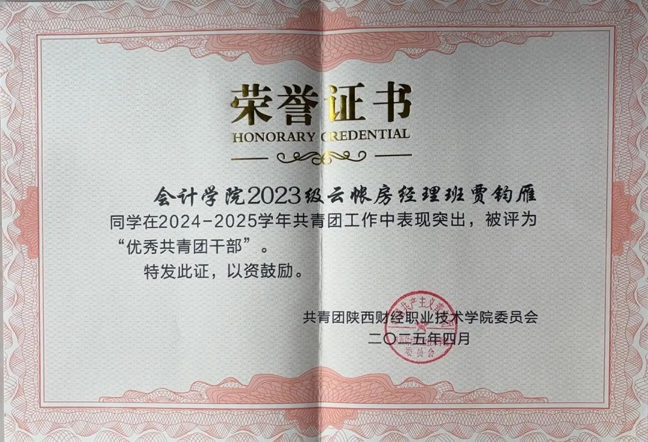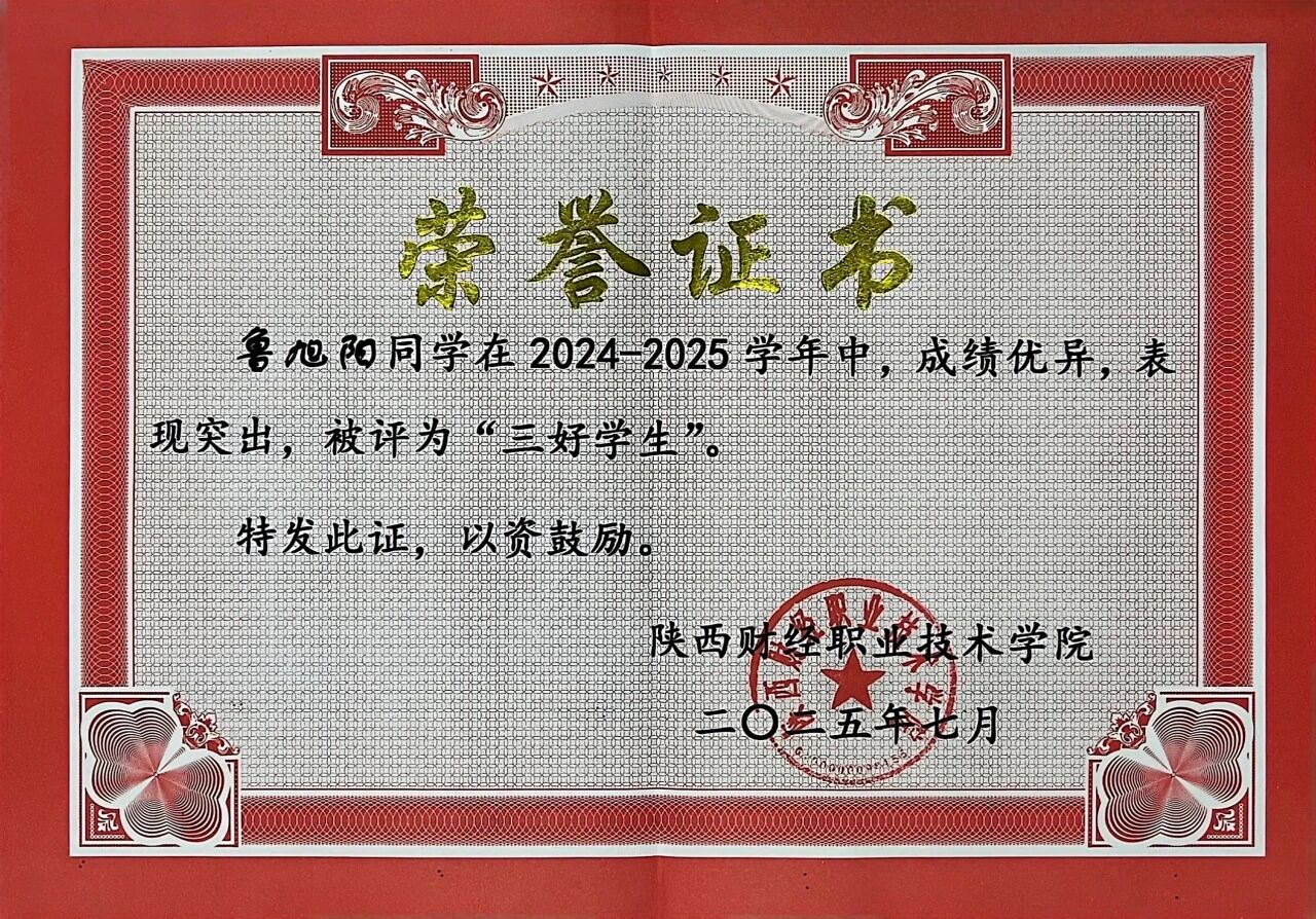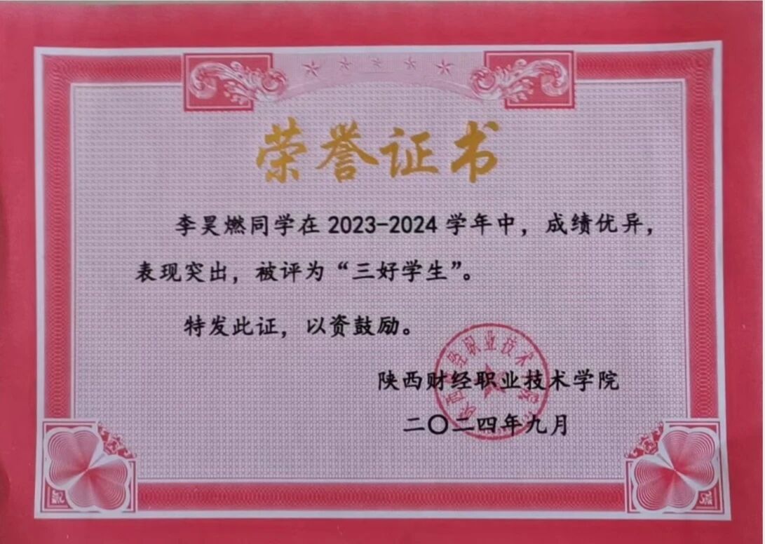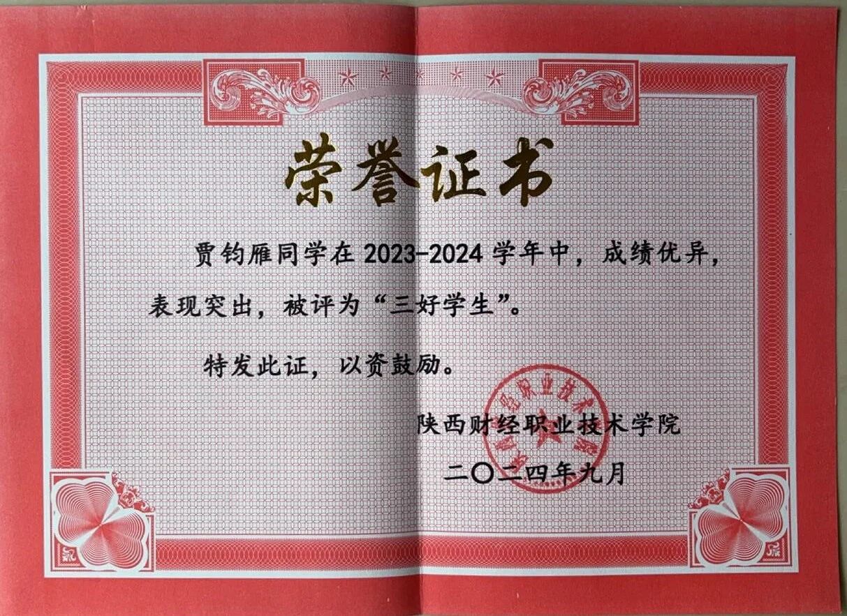 该生在校期间以扎实的专业功底为基础,刻苦钻研,获得“三好学生”荣誉称号,取得全国会计专业技术初级资格证书;在跨领域竞赛中持续突破,在2025中国国际大学生创新大赛中斩获陕西省两金一银、2024一带一路暨金砖国家技能发展与技术创新大赛全国三等奖以及2024“双百工程”陕西省最佳团队奖等荣誉奖项。在实践上,积极参与社会实践与志愿服务活动,被授予“优秀志愿者”、“先进个人”等荣誉称号,在提升自身综合素质的同时也实现了知识与实践的双向赋能。