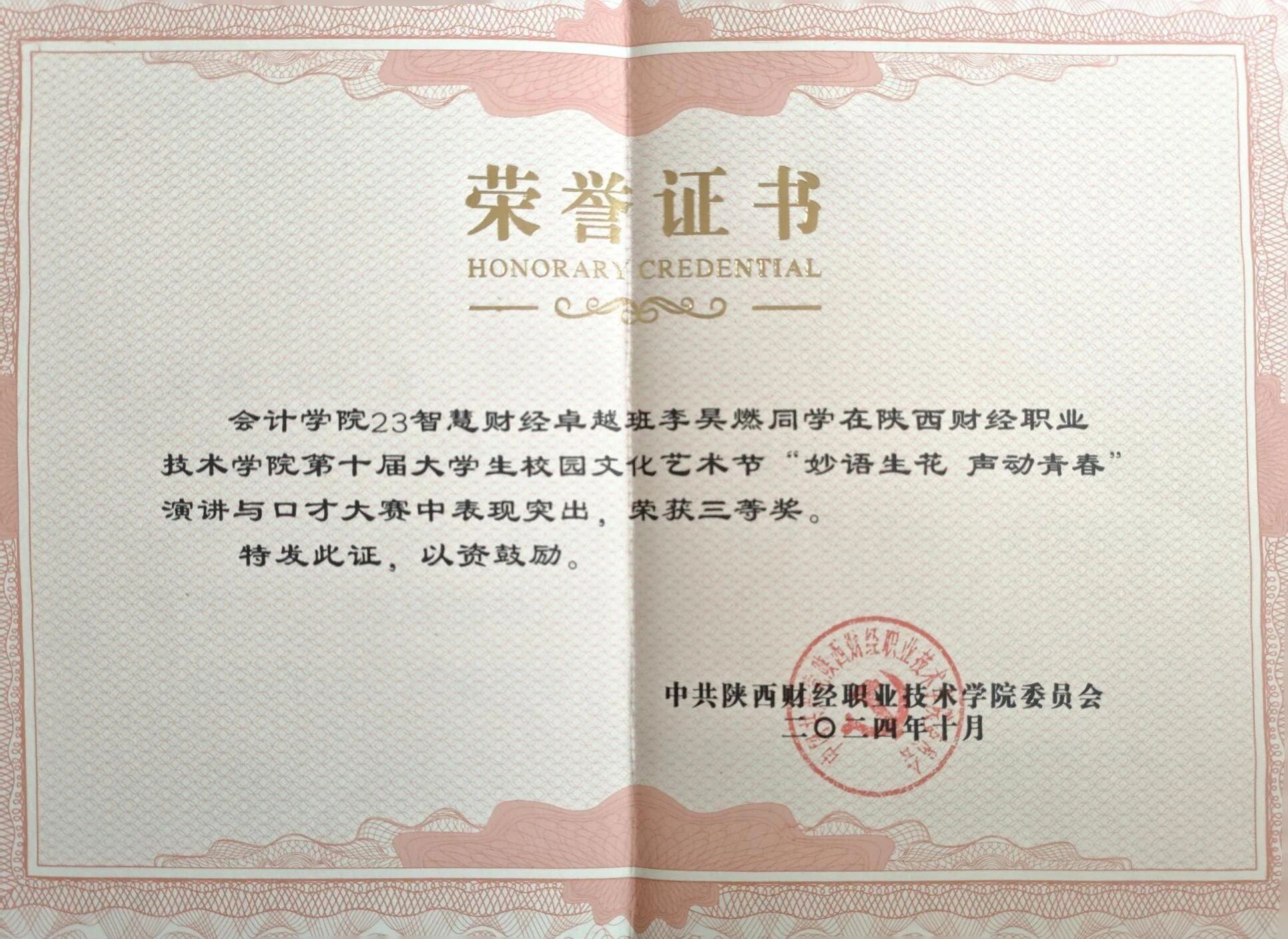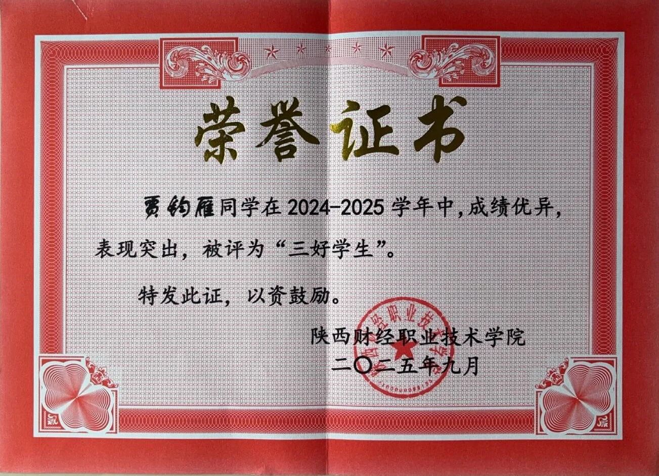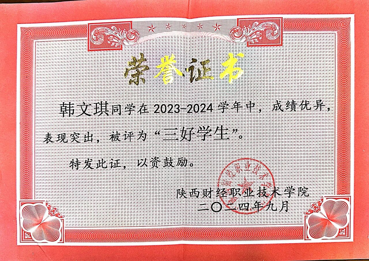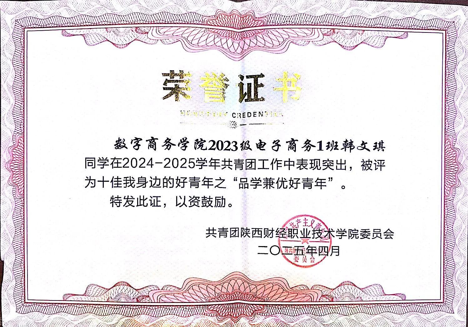 该生在校期间以扎实的专业功底为基础,刻苦钻研,获得“三好学生”荣誉称号,取得全国会计专业技术初级资格证书;在跨领域竞赛中持续突破,在2025中国国际大学生创新大赛中斩获陕西省两金一银、2024一带一路暨金砖国家技能发展与技术创新大赛全国三等奖以及2024“双百工程”陕西省最佳团队奖等荣誉奖项。在实践上,积极参与社会实践与志愿服务活动,被授予“优秀志愿者”、“先进个人”等荣誉称号,在提升自身综合素质的同时也实现了知识与实践的双向赋能。