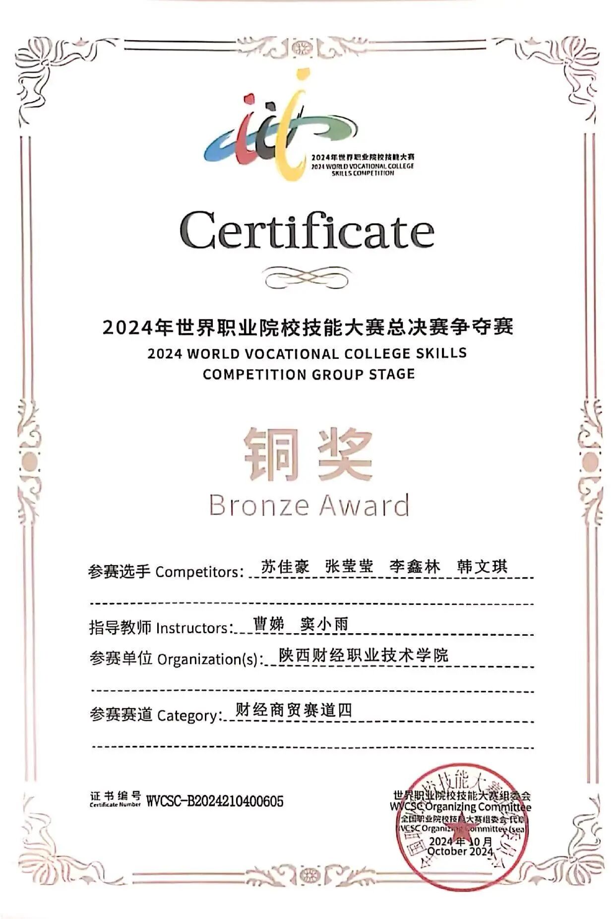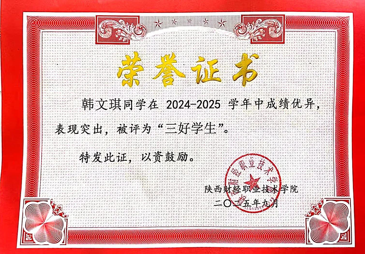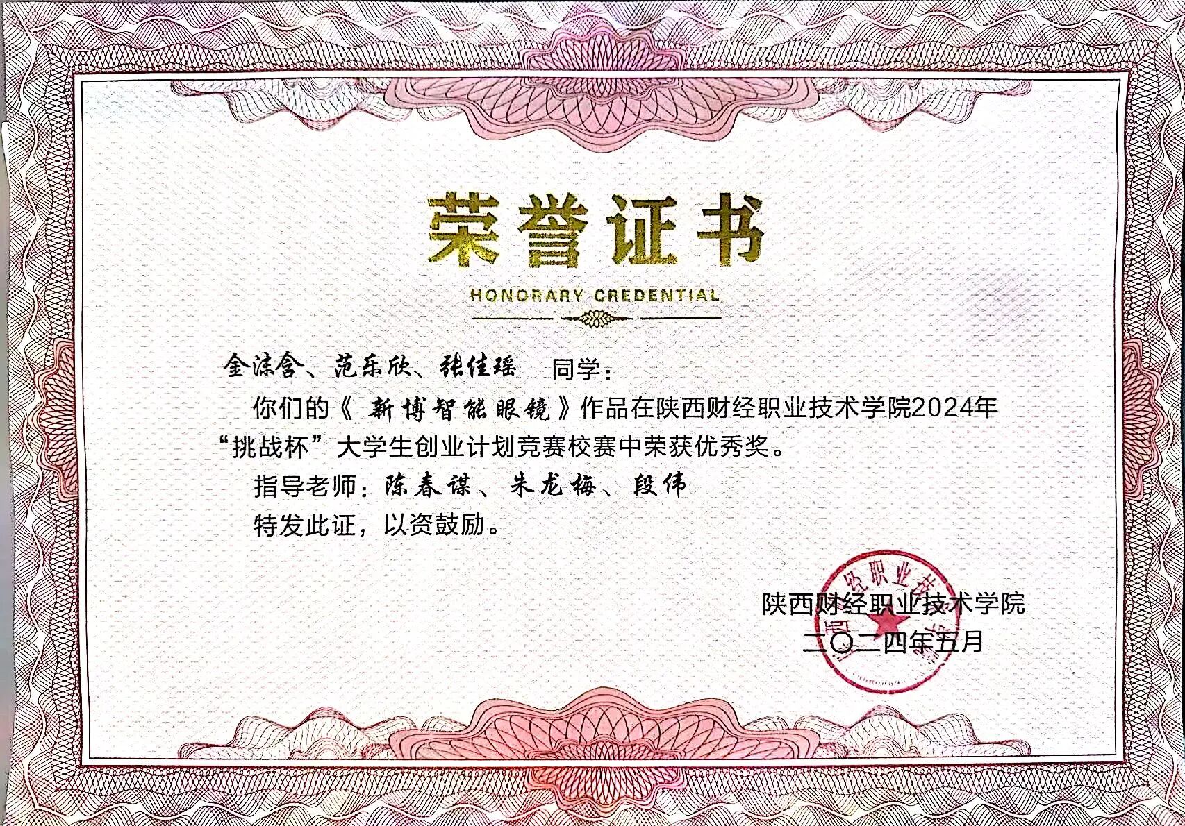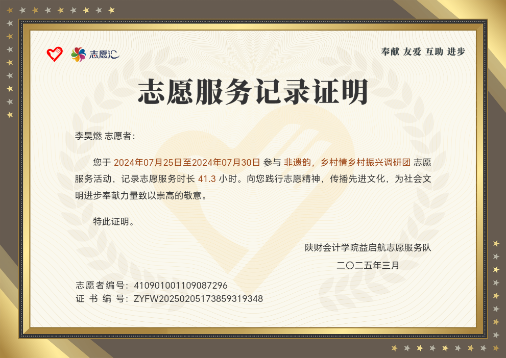 该生在校期间以扎实的专业功底为基础,刻苦钻研,获得“三好学生”荣誉称号,取得全国会计专业技术初级资格证书;在跨领域竞赛中持续突破,在2025中国国际大学生创新大赛中斩获陕西省两金一银、2024一带一路暨金砖国家技能发展与技术创新大赛全国三等奖以及2024“双百工程”陕西省最佳团队奖等荣誉奖项。在实践上,积极参与社会实践与志愿服务活动,被授予“优秀志愿者”、“先进个人”等荣誉称号,在提升自身综合素质的同时也实现了知识与实践的双向赋能。