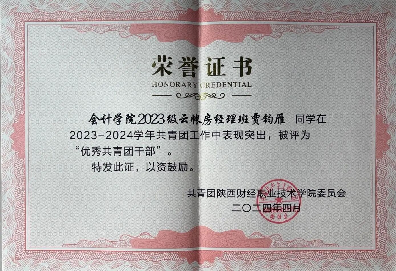 贾钧雁,女,汉族,中共预备党员,2004年11月出生,会计学院2023级云帐房经理班学生。