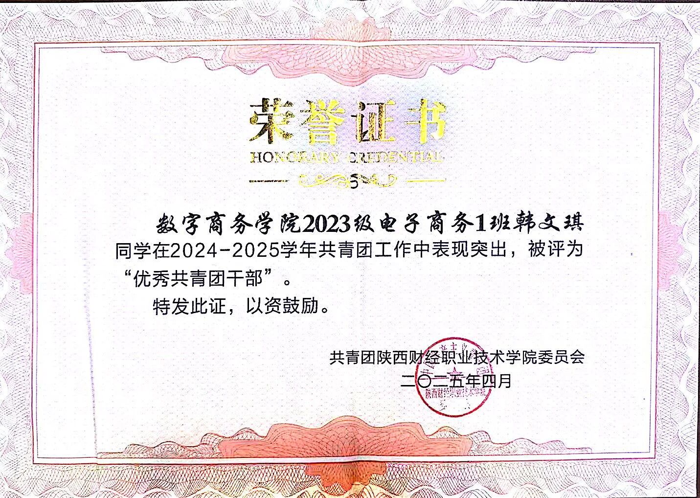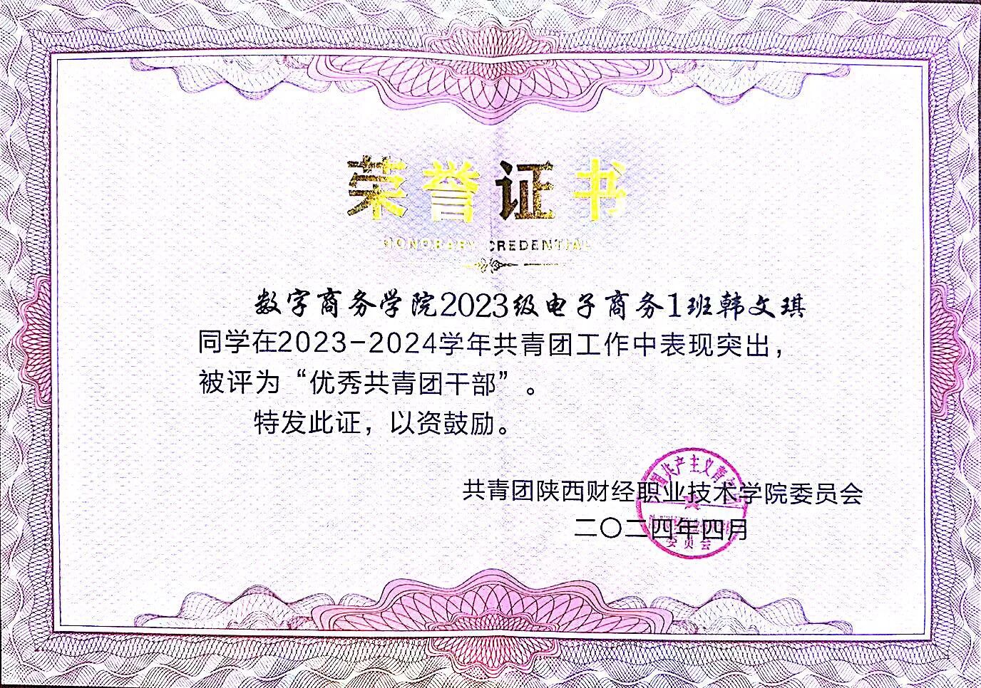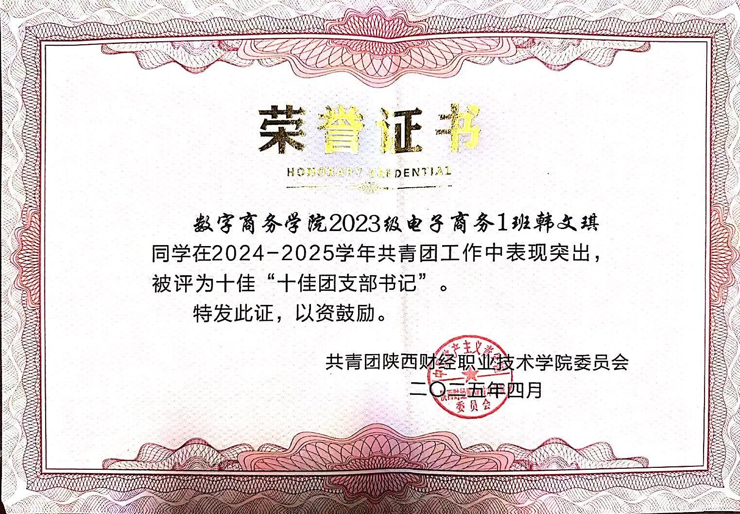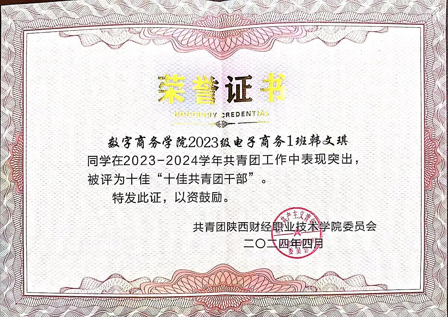 韩文琪,女,汉族,中共预备党员,2004年11月出生,数字商务学院2023级电子商务专业1班学生。