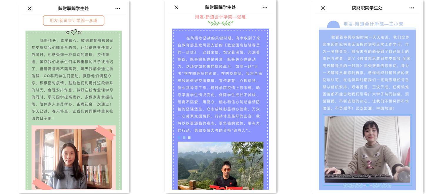 三是强化关心爱护,疫情无情人有情,要时刻关注学生的思想动态与心理健康,通过谈心谈话、心理辅导帮助学生舒缓心理压力,通过指导学生设计推荐书、参加网络招聘会、进行职业岗位分析等帮助毕业生做好就业工作,通过多方式的资助帮助家庭经济困难学生,每天的联系、经常性的叮嘱,把温情、温暖、温度传递给学生。