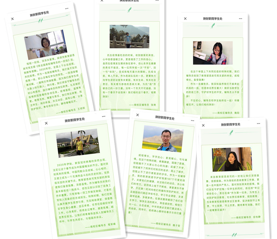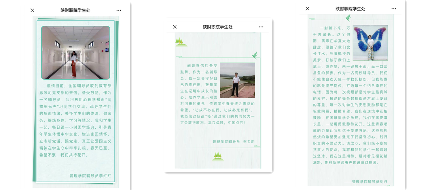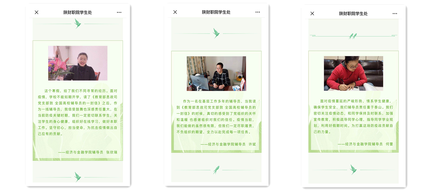 坚守初心,担当使命,我院辅导员定当恪尽职守、履职尽责,为抗击疫情做出自己应有的贡献,不辜负“娘家人”的期望。