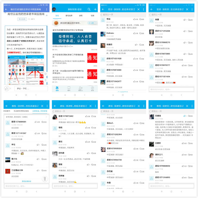 2月23日下午,南校区通过易班平台轻应用功能快速搭建了《陕财职院南校区疫情防控承诺签订》应用。应用包括导入卡图、传染病防治刑法之规定、疫情防控承诺书、签订疫情防控承诺书并登记信息、众志成城共抗疫情等功能模块,涉及疫情防控宣传、防疫法律知识、疫情防控安全责任、疫情防控承诺签订、在线讨论交流等。