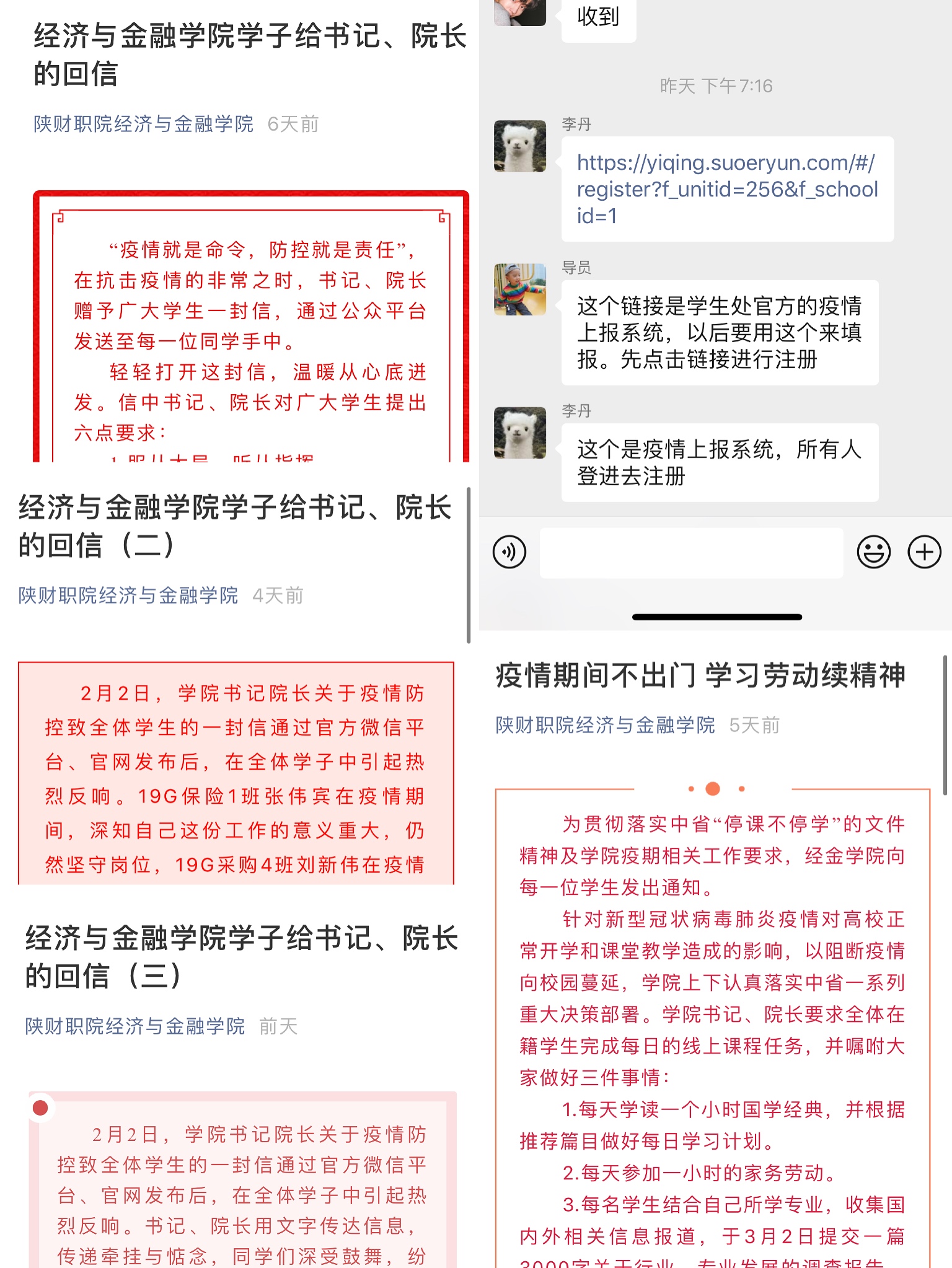 隔离病毒不隔离爱。书记院长关于疫情防控致全体学生的一封信在全体学子中引起热烈反响,同学们纷纷向书记院长提笔回信,汇报自己在家的学习生活状况和对疫情防控的关注,同时,向张书记、程院长对同学们的关怀表达衷心的谢意。2月18日,学院向每一位学子提出要求,要求大家在疫情防控期间做好“三件事”,学习国学经典,参与家务劳动、结合当前疫情和本专业实际撰写调研报告。同学们积极响应,认真学习经典书籍,很多同学一改往日吃饭睡觉打游戏的懒散作风,主动承担家务劳动,逐渐形成良好习惯。