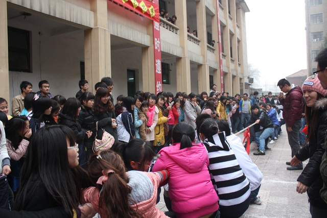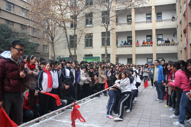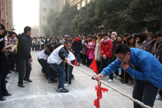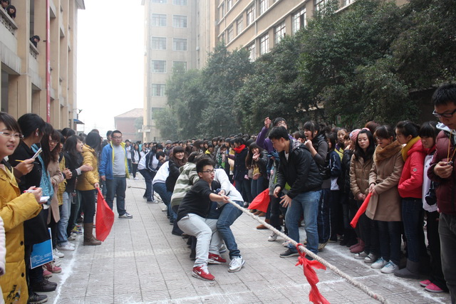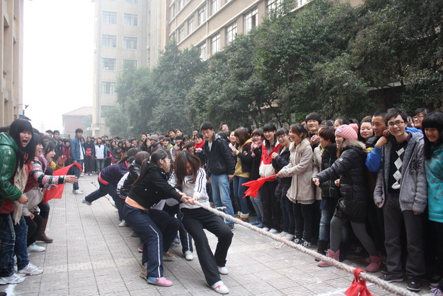 2011年12月2日、5日,南校区在2号教学楼前举行了2011级学生拔河赛,南校区30个班级全部参赛。同学们也一改往日的斯文,个个生龙活虎,斗志十足,冠军的悬念只有到最后才能揭晓。本次比赛旨在培养同学们团结协作的集体主义精神和拼搏进取的优良作风。比赛以班为单位,采取男女混合、三局两胜制的方式进行。由于班级较多,先进行抽签分组,每组优胜队晋级下一轮比赛。在开幕式上,南校区办公室张朴老师致开幕词,程军峰老师宣读比赛规则,拔河比赛在高昂的音乐声中拉开帷幕。每班除了参赛队员以外,其他同学都自动组成拉拉队为本班加油。每场比赛都异常激烈,只见哨声一响,两边队员都整齐地往后倒、向后退,看来都预练了多次。男生个个都面红耳赤,竭尽全力;女生也毫不示弱,放下了平时的淑女风范,使尽浑身力气将绳拉向自己一方。绳中间的砝码也成了墙头草,在两边倒来倒去。拉拉队此时竭力大叫“加油”,在气势上也力求压住对方,大有不到胜利誓不罢休之势,一点也不比队员轻松。他们冲着队员大喊,手臂指挥他们向后退,好像在隔空传功,“一二三,加油!一二三,加油!”在这振聋发聩的呐喊声中,本班队伍往往能够把绳向后拖一点。比赛真是精彩纷呈,每场比赛一般都是第三局才能决出胜负,可见各队实力都相差不大,此时拼的就是团结了,团结就是力量!经过多场鏖战,会电十一班代表队最终获得冠军,会计十二班获得第二名,会计一班获得第三名,这些班级可谓实至名归,祝贺他们,这是属于集体的荣誉!希望他们能把这种势头带到学习工作中去,再创辉煌!比赛结束后,同学们发表很多感慨,有同学说这是他们生平第一次拔河,有同学说这是他们上高中以来第一次拔河,虽然在这次的比赛中差一点就“牺牲”了,但能为班级做贡献非常值得。同学们都表示,本次比赛表现出来的团结协作精神和顽强拼搏的作风,体现了南校区各班级的团结和凝聚力,展现了南校区同学良好的精神风貌,大家都希望在以后的学习工作生活中,继续弘扬本次比赛表现出来的优良精神和作风,并让它发扬光大!