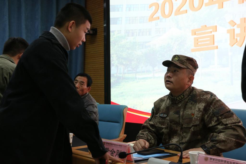 为贯彻落实省上征兵工作会议精神,切实做好我院2021年大学生应征入伍工作,12月24日下午,我院在继续教育培训中心举办2020年大学生征兵工作宣讲会。秦都区人武部部长黄金刚、秦都区人武部副部长华永伟、秦都区人武部军事科参谋王渊应邀宣讲,征兵工作负责人侯晓军和近百名学生代表参加会议。会议由学生工作处副处长贺适主持。