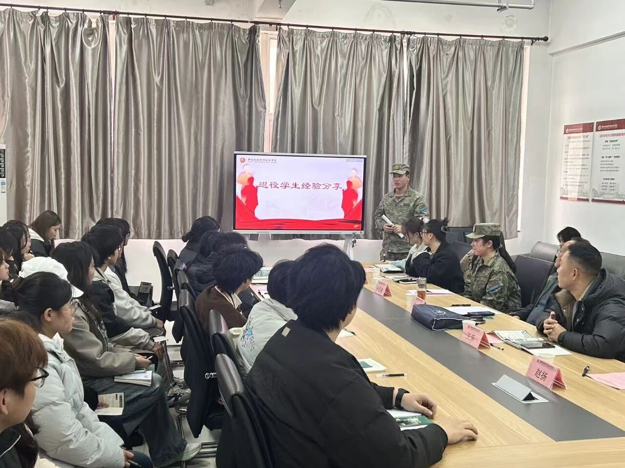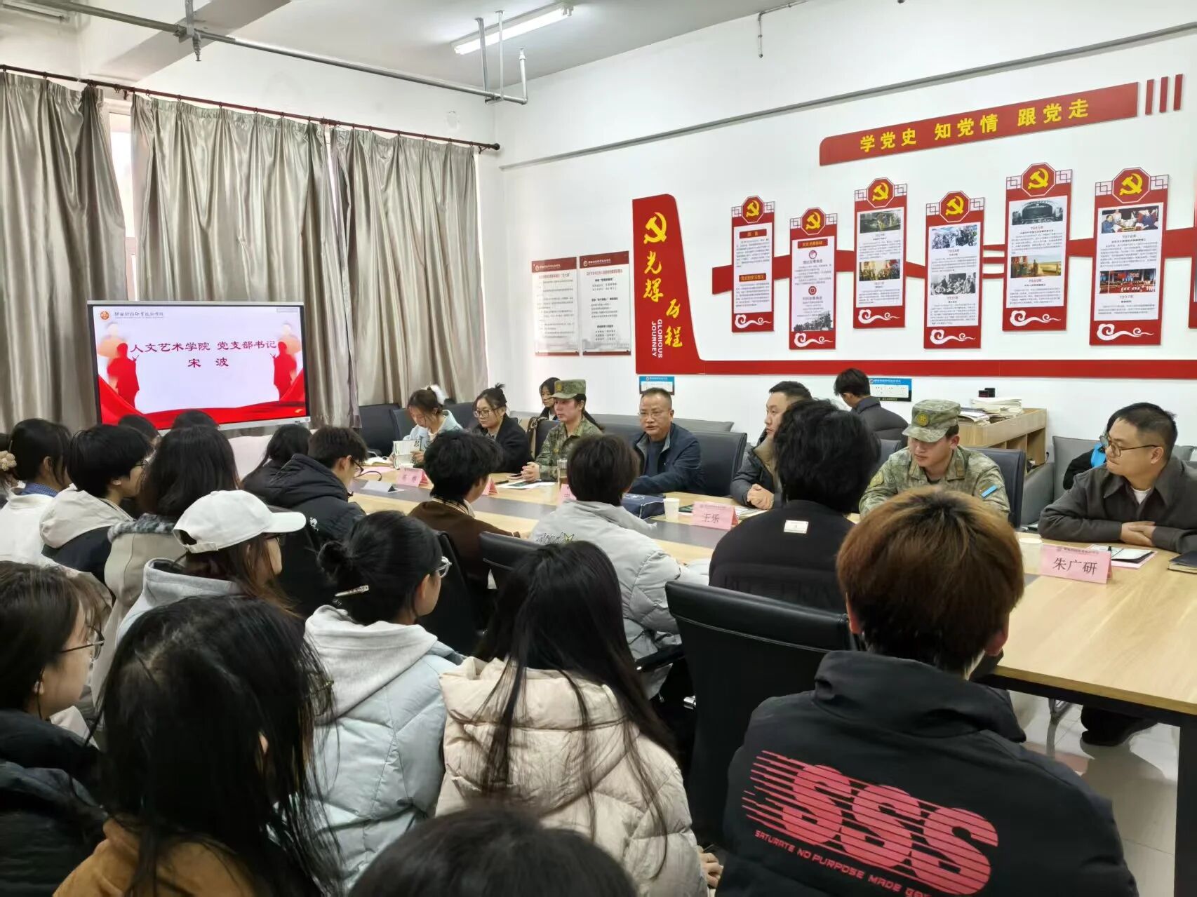 近日,我校人文艺术学院“投身国防圆壮志,精准帮扶成人才”征兵政策宣讲交流会成功举办,校征兵工作站王乐老师、“青春迷彩绿”骨干受邀参加,人文艺术学院党支部书记宋波、各辅导员老师、50余名同学参加交流会。