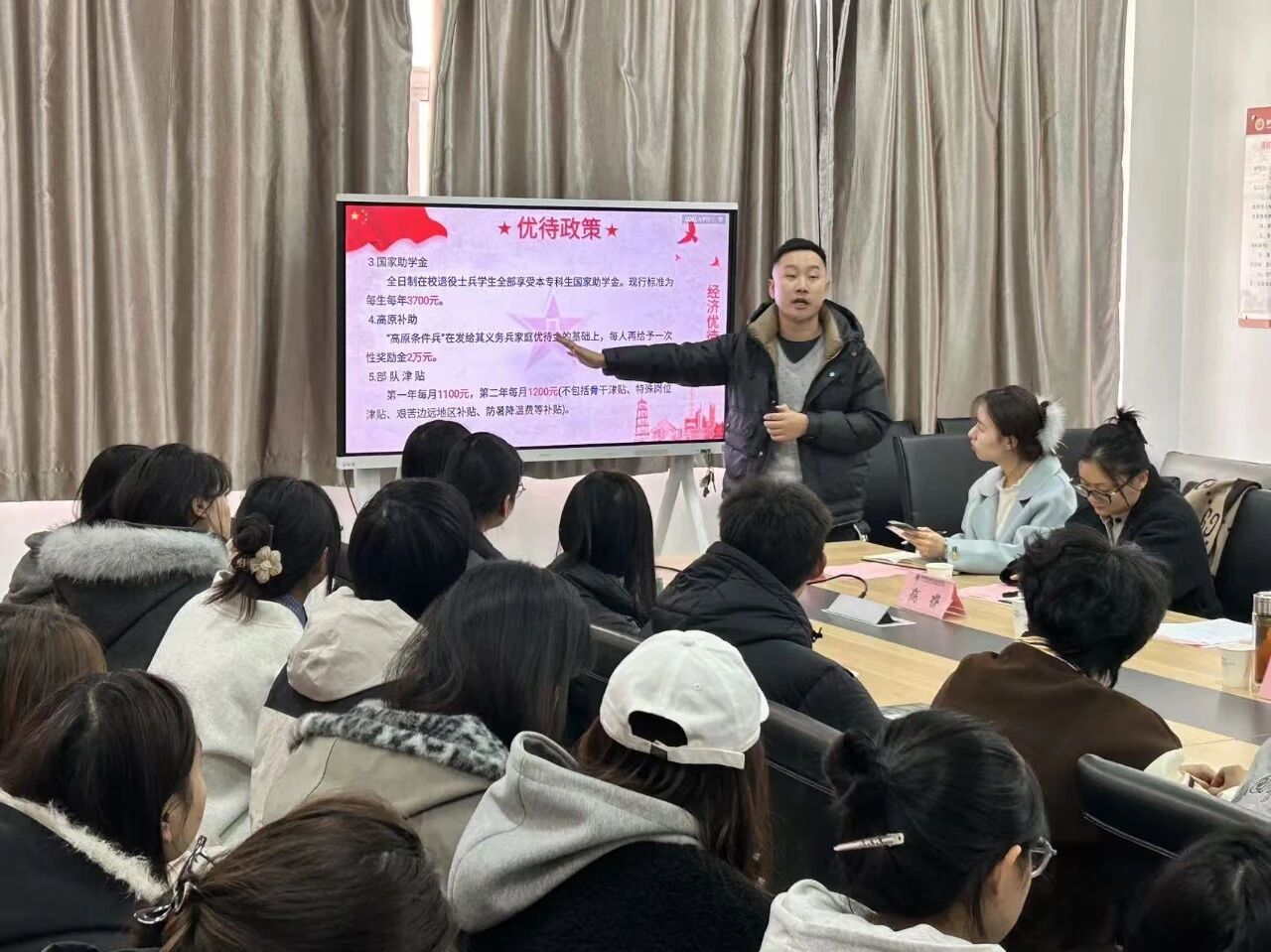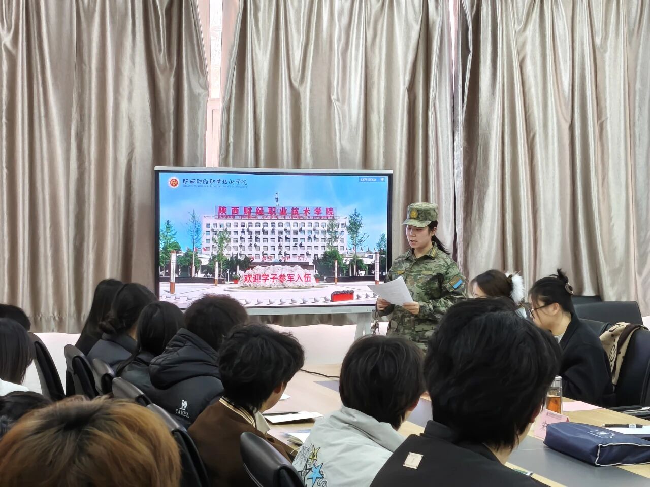 首先,王乐老师从政策解读、经济优待、学业保障三方面出发,用详实的数据及具体实例为同学们依次讲解了大学生参军入伍的政策要点及发展规划,他鼓励同学们:携笔从戎,去部队建功立业,用青春芳华书写陕财学子的精彩人生。
